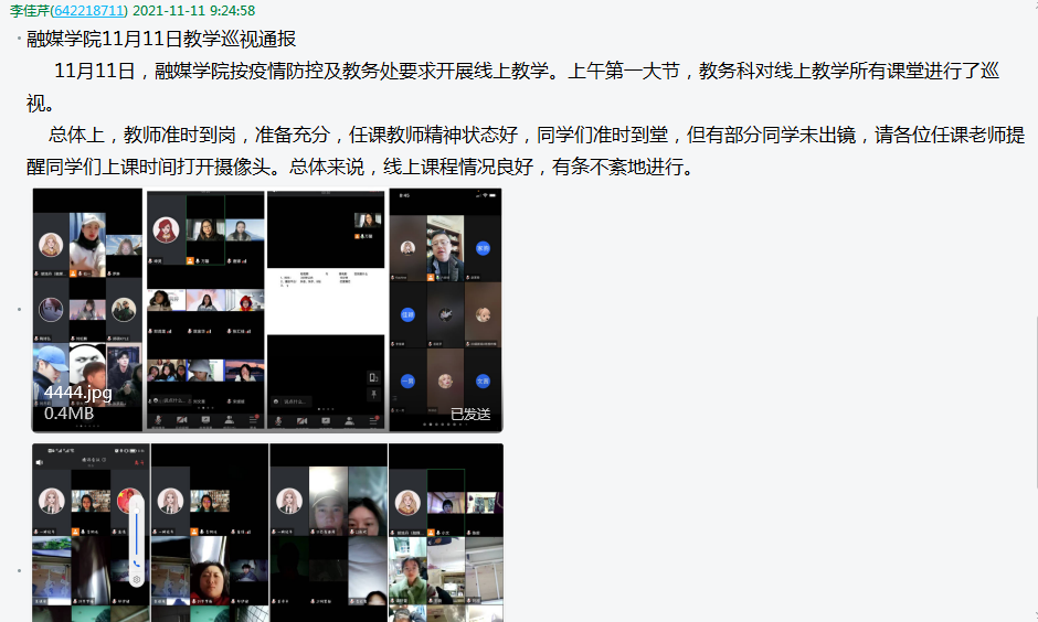 为切实保障线上教学工作高质量开展,学院教务人员进入线上课堂,通过在线看课、阅览课程教学资料等方式,对线上教学课程实施全覆盖检查,并每天将巡课结果通报至工作群。