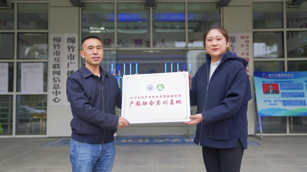 随后,秦勉向绵竹市融媒体中心授牌“产教融合实训基地”,标志着双方在专业建设、实训基地建设、人才培养等多个方面合作关系的正式建立。