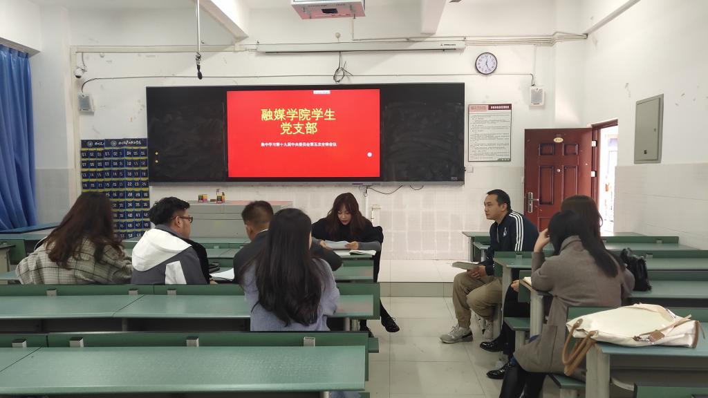 11月4日中午12点20分,融媒学院学生党支部在三教211教室集中传达学习第十九届中央委员会第五次全体会议精神。学院党总支副书记毛浩杰、学生党支部书记王玥琪以及学生党支部全体党员共同参与学习。会议由学生党支部书记王玥琪主持。