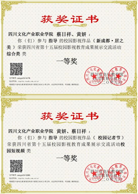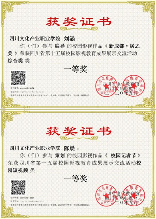 10月31日晚,四川省第十五届校园影视教育成果发布展示交流会暨颁奖典礼在南充高中临江新区举行。本次交流会由黄妍老师、蔡日祥老师带领融媒学院新闻采编与制作专业的学生参加。学生上报的作品《新成都·居之美》获校园综合类一等奖,《校园记者节》获校园短视频类一等奖。