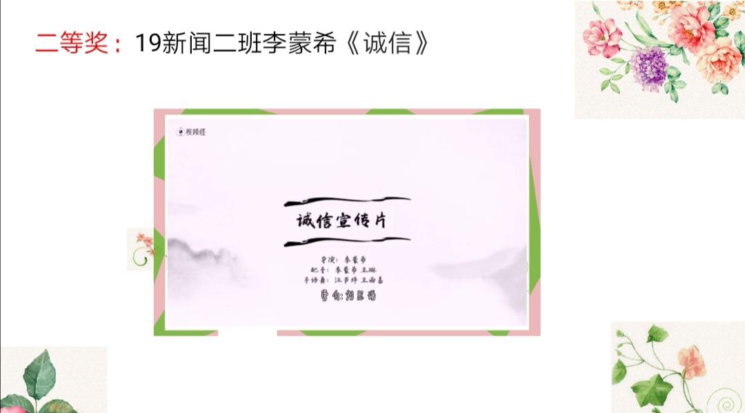 本次线上作品征集活动分为诚信公益短片(以微电影、动画、漫画形式为主)和公益宣传画两种形式。在学习部的组织下,同学们踊跃报名参与,将诚实守信主题与自身生活学习经历结合,作品体现出很大的感染力。本次活动共收到视频作品2份、宣传画80份。第一轮初选结束后,共有16份作品成功进入大众投票评选环节,在经过为期两天的投票后,来自2018级汉语班的王雨同学的作品《诚信做人》以254票荣获一等奖。