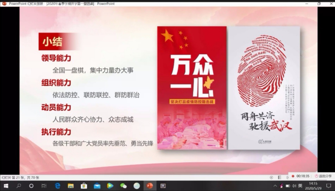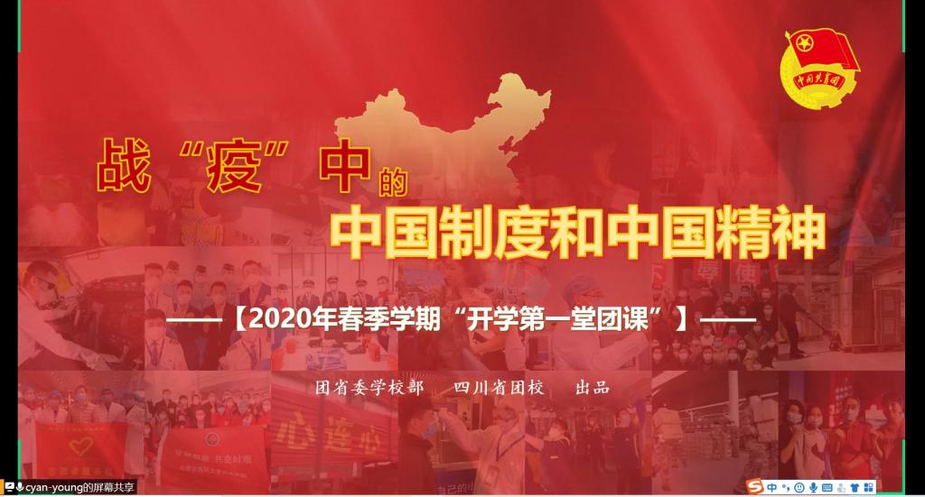 本次线上主题教育活动以团课的形式开展,主讲人由各班团支部书记担任,通过播放PPT、视频等方式为全体同学讲述疫情防控中的优秀青年事迹,引导同学们主动思考、互相交流,在讨论中感受疫情防控中的“中国速度、中国精神”,并进一步思考如何才能成为有责任有担当的青年学生。