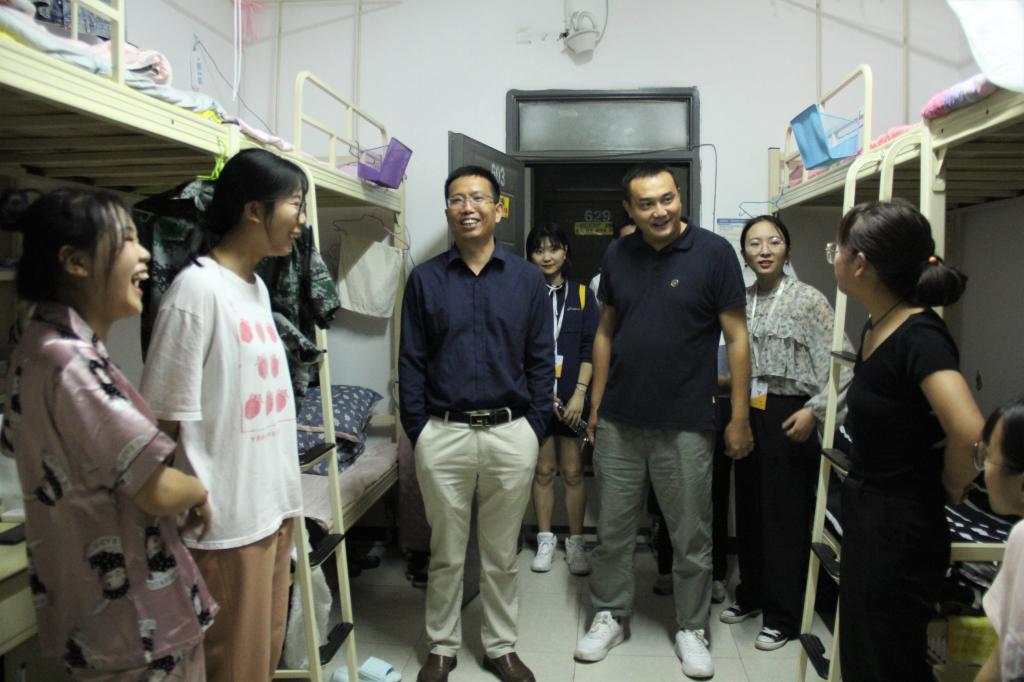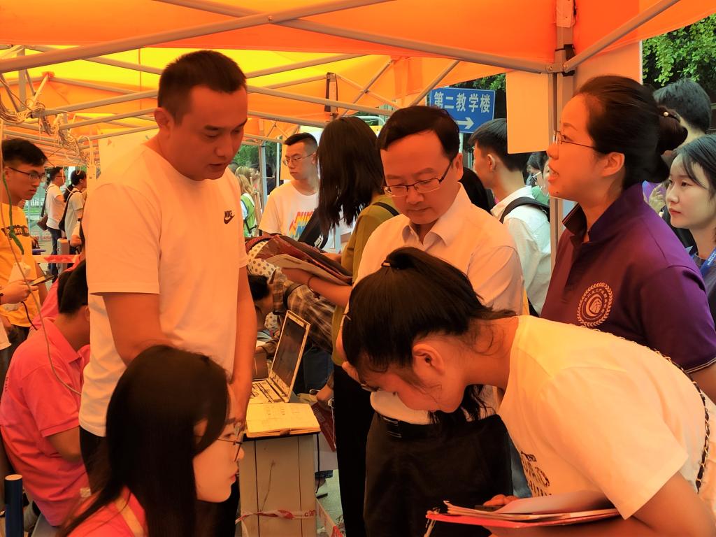 迎新期间恰逢秋雨。在现场,志愿者们将前来陪同的新生家长安排在休息处等待,并引导新生办理入学手续,他们耐心地为新生答疑解难,冒雨将新生引领到各自所在的宿舍楼。途中,志愿者们热情地向同学们介绍了学校美景、主要建筑物、食堂美食等情况,并与新生们交流学习心得,希望可以帮助他们尽快适应校园环境,更好融入大学生活。期间,我校院长罗晓东、学工部副部长卢苇来到报名现场亲切慰问了迎新工作人员,并了解新生报到情况。