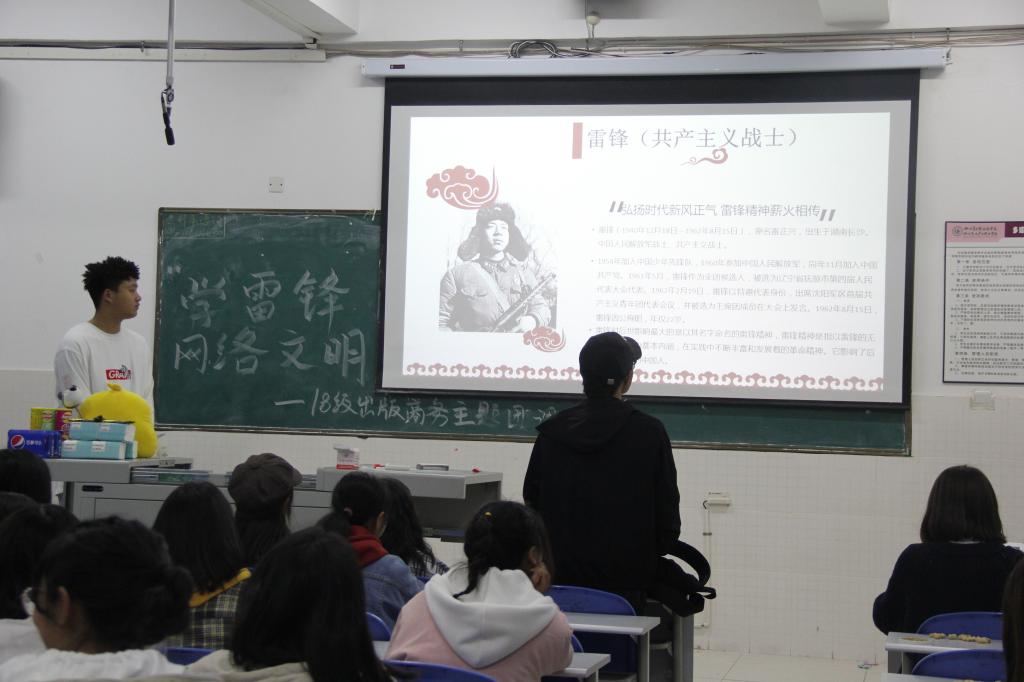 为进一步配合学校开展志愿宣传月活动,弘扬“奉献、友爱、互助、进步”的志愿者服务精神,文化传播学院组织各年级各班积极开展以“学雷锋网络文明”为主题的系列班会活动。
