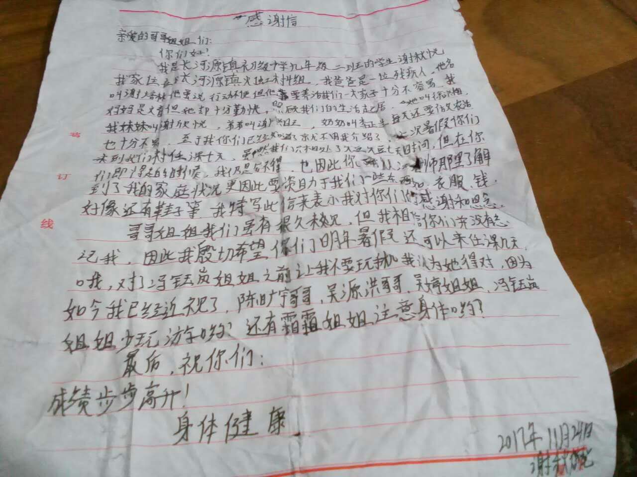 近日,文化传播学院青年志愿者协会收到了来自安岳县长河源镇灯虹村困难家庭成员之一谢欣悦小朋友的感谢信。信中表达了她对学校、老师、同学们以及各位爱心人士的感谢,同时表达了对文传青年志愿者们的思念,希望明年暑假能再次相聚。