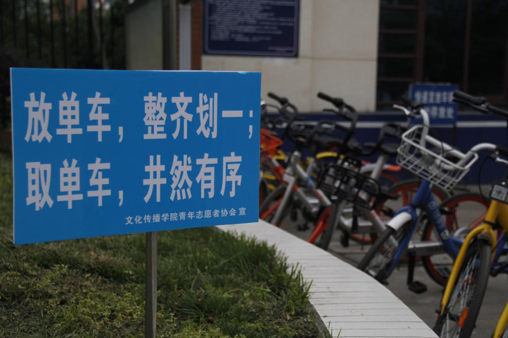 当天下午,二十多名穿着文化传播学院院服的志愿者,忙碌在我校正门、教职工宿舍出口和东侧临时通道处,他们认真地将道路上随意停放的共享单车进行整齐摆放,并在单车停放处张贴“放单车,整齐划一;取单车,井然有序”等内容的告示牌。同时,志愿者们对共享单车的使用者温馨提醒,使用后要有序停放。