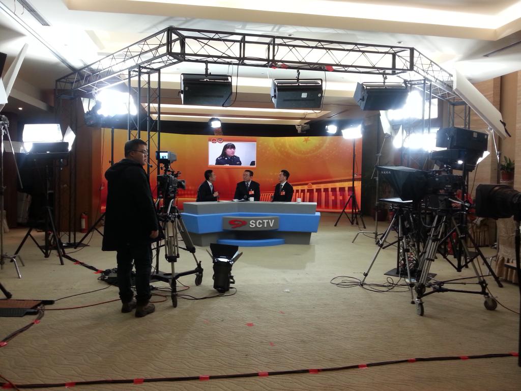 首先观摩了川台在北京搭建的260平米临时演播室,它支持播报、访谈、连线、配音、编辑等全套新闻节目制作工作。母华向技术部人员详细咨询了演播室搭建的流程及注意事项。