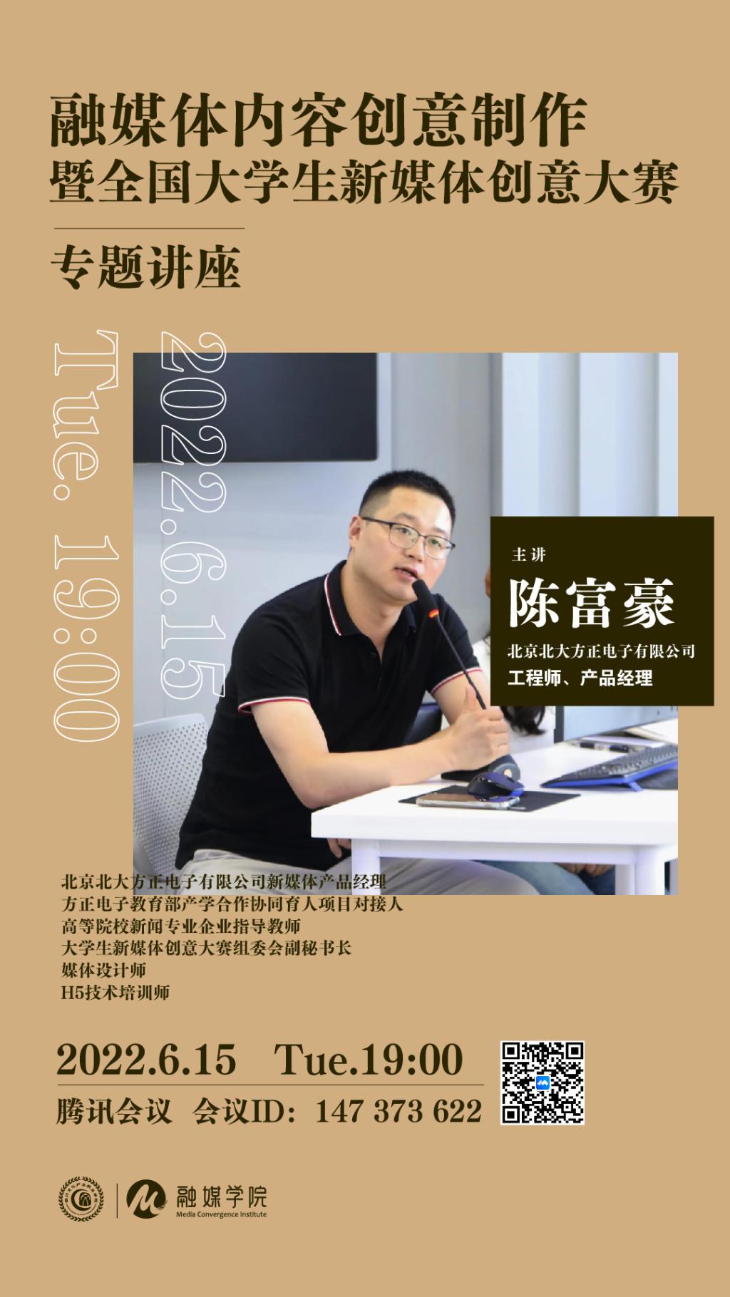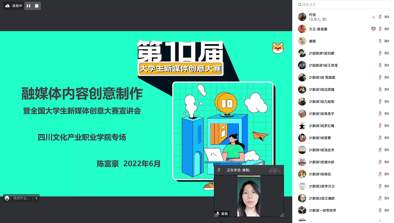 为贯彻落实“以赛促教、以赛促学”的精神,提高学生学习积极性与专业技能,2022年6月15日,我院通过腾讯会议线上讲座的形式开展了“融媒体内容创意制作暨全国大学生新媒体创意大赛线上专题讲座”。活动邀请到北京北大方正电子有限公司工程师、新媒体产品经理陈富豪对大赛细则进行宣讲。我院副院长唐颖,影视多媒体技术专业主任代悦,以及20级、21级影视多媒体技术、新闻采编与制作专业学生参加此次活动。
